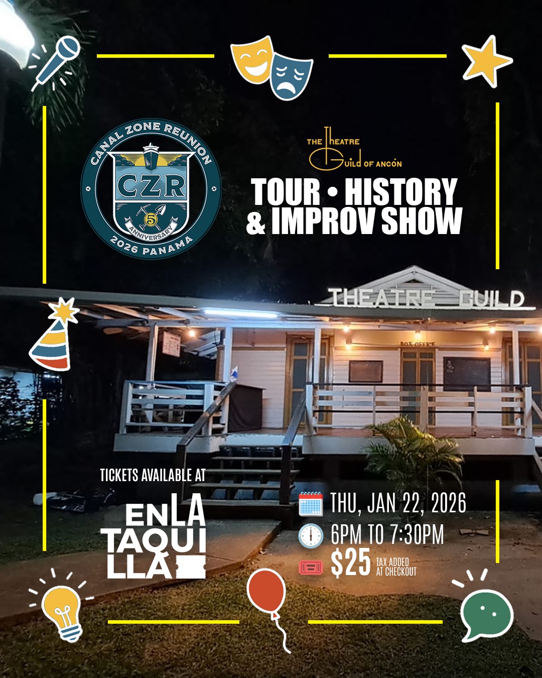 Celebrate the Theatre Guild of Ancon’s 75th anniversary during the Canal Zone Reunion with an evening of history, laughter, and community. Guests will enjoy guided tours of Panama’s longest-running playhouse, exclusive photo opportunities, a short documentary on the Guild’s legacy, and a lively ImprovTGA performance.